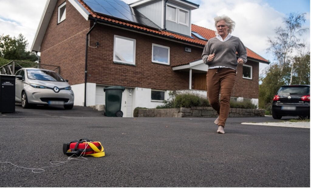 “Ik was op weg naar mijn werk in het plaatselijke ziekenhuis toen ik uit het autoraam keek en een man zag instorten op zijn oprit”, zegt dr. Ali. “Ik begreep meteen dat er iets mis was en haastte me om te helpen. De man had geen pols, dus begon ik te reanimeren (cardiopulmonale reanimatie) terwijl ik een andere omstander vroeg om 112 (het Zweedse alarmnummer) te bellen. Slechts enkele minuten later zag ik iets vliegen boven mijn hoofd. Het was een drone met een defibrillator!”