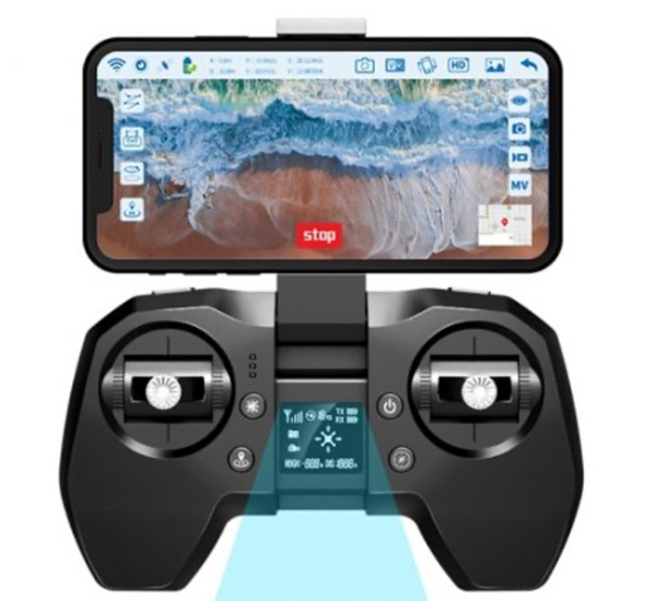De controller van de Hubsan H502E ligt door zijn formaat lekker in de handen en er zitten diverse knoppen op de controller. Rechts achter bevindt zich een knop waarmee je de Hubsan H502E eenvoudig en snel terug laten vliegen naar het vertrekpunt (return home button). Links achter zit de knop om de foto’s en video’s te maken met de H502E drone. Met een enkele druk op de knop maak je een foto en als je de knop wat langer ingedrukt houdt zal de camera van de drone een video gaan opnemen. Met de twee joysticks op de controller laat je de Hubsan H502E stijgen en dalen en bepaal je de richting. Op het schermpje op de controller zie je onder andere wat de status van de accu is.