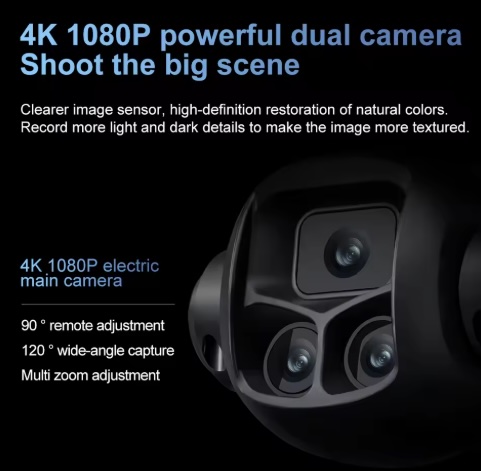 De V916 Max drone is uitgerust met een slim camerasysteem dat zorgt voor stabiele en scherpe opnames vanuit de lucht. De drone beschikt over een hoofdcamera aan de voorzijde voor het maken van foto’s en video’s, gecombineerd met een onderste camera die helpt bij positionering en stabiliteit tijdens het vliegen. Dankzij deze combinatie blijft de drone beter op zijn plek hangen en maak je eenvoudiger vloeiende beelden, zelfs als je nog weinig vliegervaring hebt.