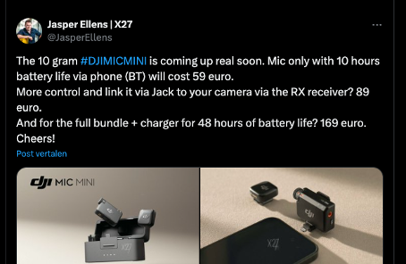 De details over de veelbesproken DJI Mic Mini lijken steeds concreter te worden. Tech-insider Jasper Ellens deelde op X (voorheen Twitter) interessante informatie over deze aankomende microfoon van DJI. Met een gewicht van slechts 10 gram, een scherpe prijs en verschillende gebruiksopties lijkt dit dé must-have audio-oplossing te worden voor content creators en professionals.